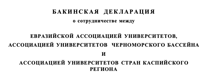 1 ноября 2009 года подписана Бакинская декларация о сотрудничестве между Евразийской ассоциацией университетов, Ассоциацией университетов Черноморского бассейна и Ассоциацией университетов стран Каспийского региона.